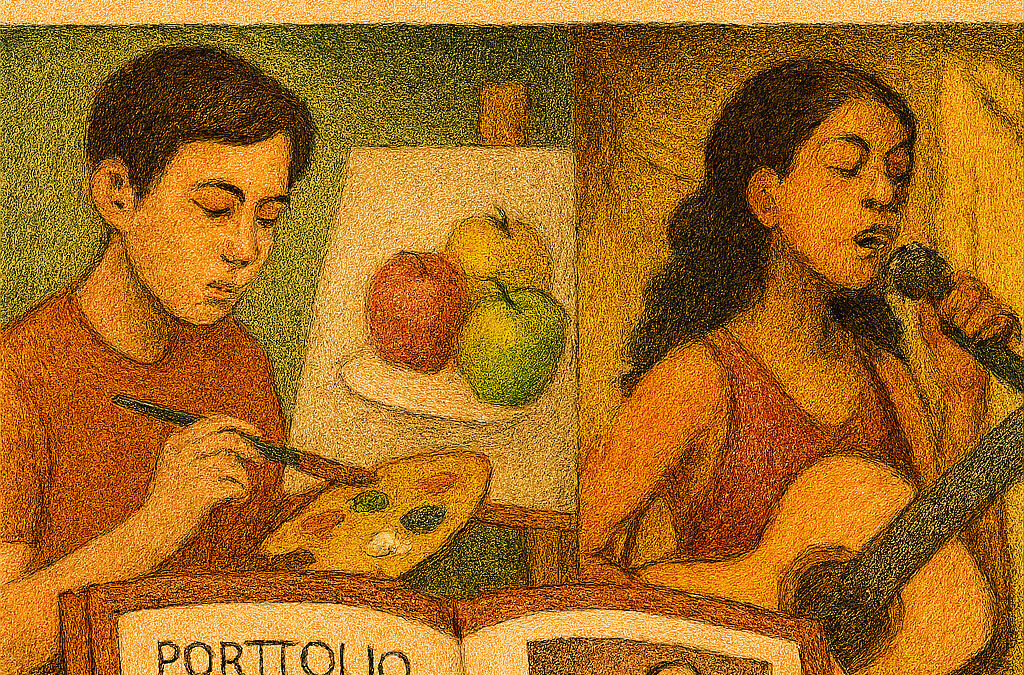 2. 공연 예술 포트폴리오 노래, 춤, 연극, 기악 부분은 재능과 다양성을 강조하는 비디오 또는 녹음과 깊이 있는 감성을 표현한다. 기술적인 능력뿐 아니라 무대 장악력과 자신감을 보여준다.